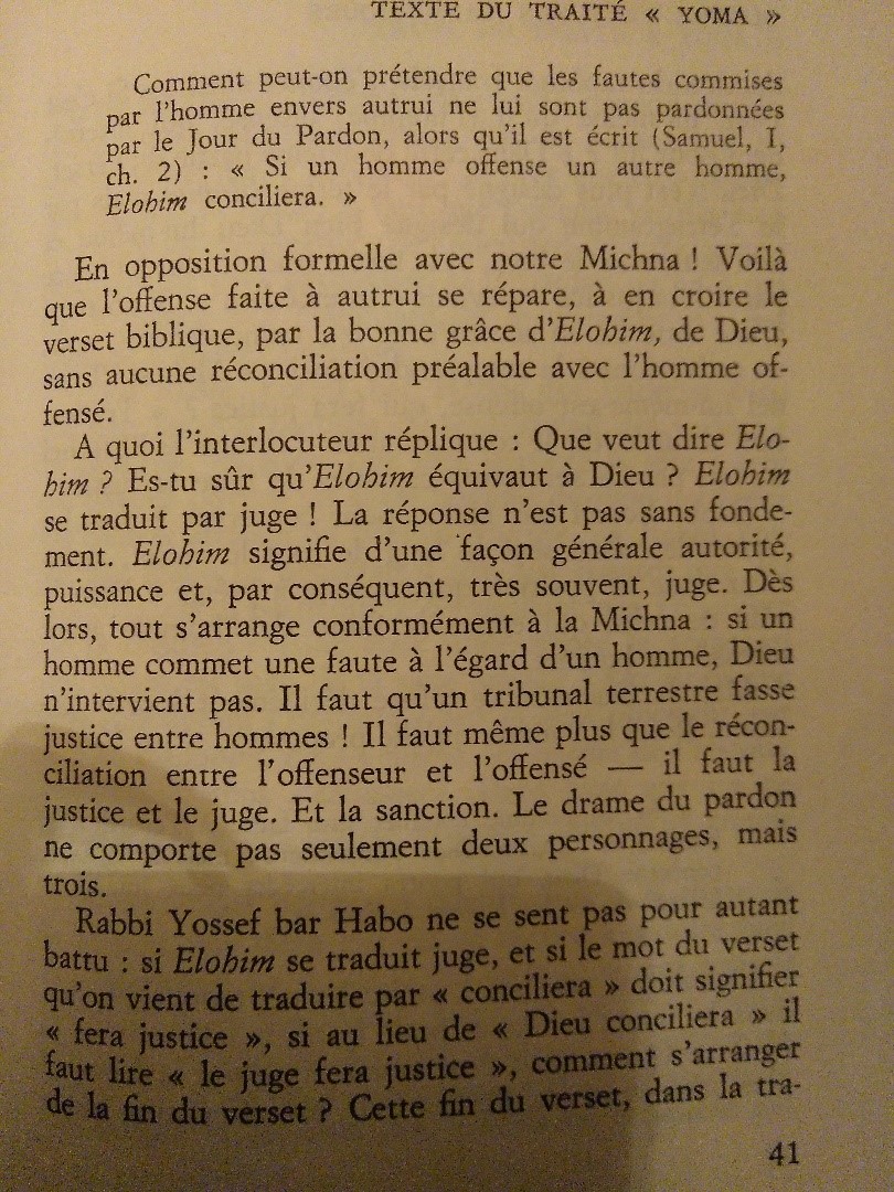 Rabbi Yosef bar Habo a objecté à Rabi Abahou les fautes qui sont entre l’adam et son ami YOH »K ne recouvre pas et c’est ce qui est écrit si un homme faute envers un homme élohim intercède qu’est-ce que c’est élohim un juge si c’est ainsi je dis lis la fin et si un homme faute envers élohim qui intercèdera pour lui comme il est dit si un homme faute envers un homme et elohim intercède pour lui il lui pardonnera et si c’est vers l’Eternel que l’homme faute qui intercédera pour lui la téchouva et les bonnes actions Rabbi ItsHak a dit toute personne qui provoque son ami même en paroles doit l’apaiser comme il est dit mon fils 1 Mon fils, si tu t’es porté garant pour ton prochain, si tu as engagé ta parole pour un étranger, 2 tu es pris au piège de tes promesses; tu es devenu le prisonnier de ta parole. 3 Fais donc ceci, mon fils, pour recouvrer ta liberté, puisque tu es tombé au pouvoir d’autrui: va, insiste avec énergie et livre un assaut à ton prochain si tu as de l’argent délie pour lui ta main et si non multiplie sur lui les amis.