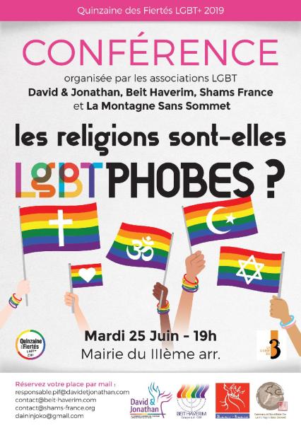 Cette conférence est organisée par les associations LGBT confessionnelles, David et Jonathan (LGBT Chrétien, le Beit-Haverim (Groupe juif LGBT), Shams France (Association LGBT pour les personnes du Maghreb et du Moyen-Orient) et également La Montagne Sans Sommet (Communauté bouddhiste)