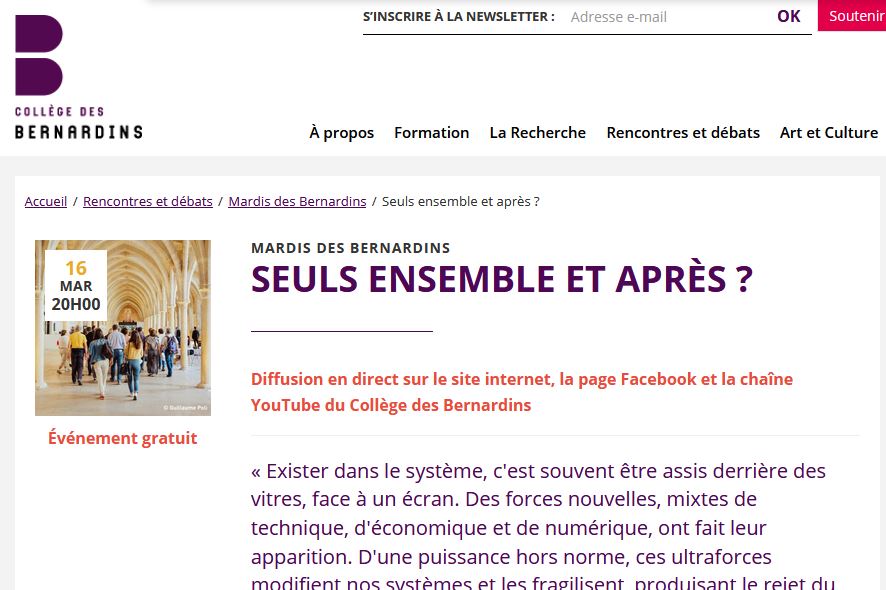 Demain soir à 20h, je me réjouis de participer à une table-ronde prometteuse aux Bernardins, à suivre sur leur chaine youtube par exemple, infos ici: https://www.collegedesbernardins.fr/content/seuls-ensemble-et-apres