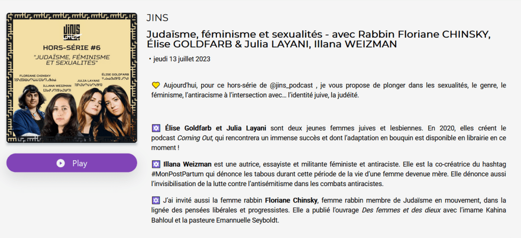 đŁ Un immense merci Ă JINS pour ce bel Ă©pisode de podcast que je partage avec vous! Pour l’Ă©couter, c’est ici, sur ce lien. Que cet Ă©pisode, comme toutes nos actions, contribuent Ă nous faire grandir ensemble, dans le respect mutuel. Parler de sexualitĂ© permet de lever les tabous et les violences. Le faire dans un podcast trĂšs populaire autour des cultures arabes et musulmanes, en accueillant des problĂ©matiques liĂ©es au judaĂŻsme est un bel acte de coopĂ©ration! Une belle façon de prĂ©parer l’entrĂ©e dans le mois de Av au cours duquel nous commĂ©morons la destruction du Temple, qui devait ĂȘtre une maison de rassemblement pour toutes les cultures… Partagez vos commentaires sous cet article, sur le post instagram de JINS ou sur le mien.