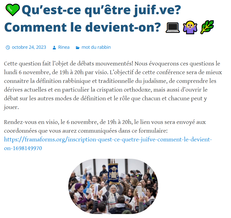 Joignez-vous Ă la conf en ligne du lundi 6 novembre, inscrivez-vous ici si ce n’est dĂ©jĂ fait: https://rabbinchinsky.fr/2023/10/24/conf-judaisme/