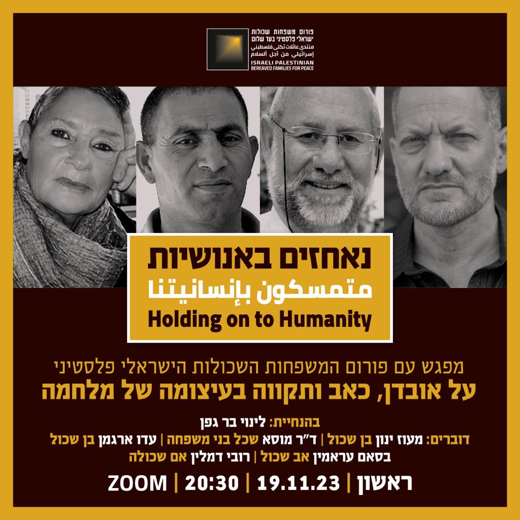 « Cultivons notre humanitĂ©, rencontre avec les familles endeuillĂ©es israĂ©liennes et palestiniennes, lien zoom: https://did.li/zFDTY. Les intervenant.es: Maoz Ynon, qui a perdu ses deux parents le 7 octobre Ă Otef Aza, Dr Moussa, qui a perdu de nombreux membres de sa famille Ă Gaza, Ido Argaman, fils endeuillĂ© et membre du Kiboutz Miflassim Ă Otef Aza, Bassam Aramin, pĂšre endeuillĂ© et Robbie Dalmin, mĂšre endeuillĂ©e. L’humanitĂ© commence par l’Ă©coute. Cela fait dĂ©jĂ presque 40 jours que nous Ă©coutons la souffrance et l’Ă©tat de choc, les cris de la perte, les histoires d’hĂ©roĂŻsme et les sirĂšnes et le son des explosions. Nous vous invitons Ă Ă©largir la portĂ©e de votre Ă©coute, Ă Ă©couter Maoz, Moussa, Ido, Bassam et Robbie, israĂ©lien.nes et palestinien.nes, tous endeuillĂ©s, tous en souffrance, tous porteurs d’apaisement et convaincus qu’autre chose est possible. Venez Ă©couter avec le coeur. »