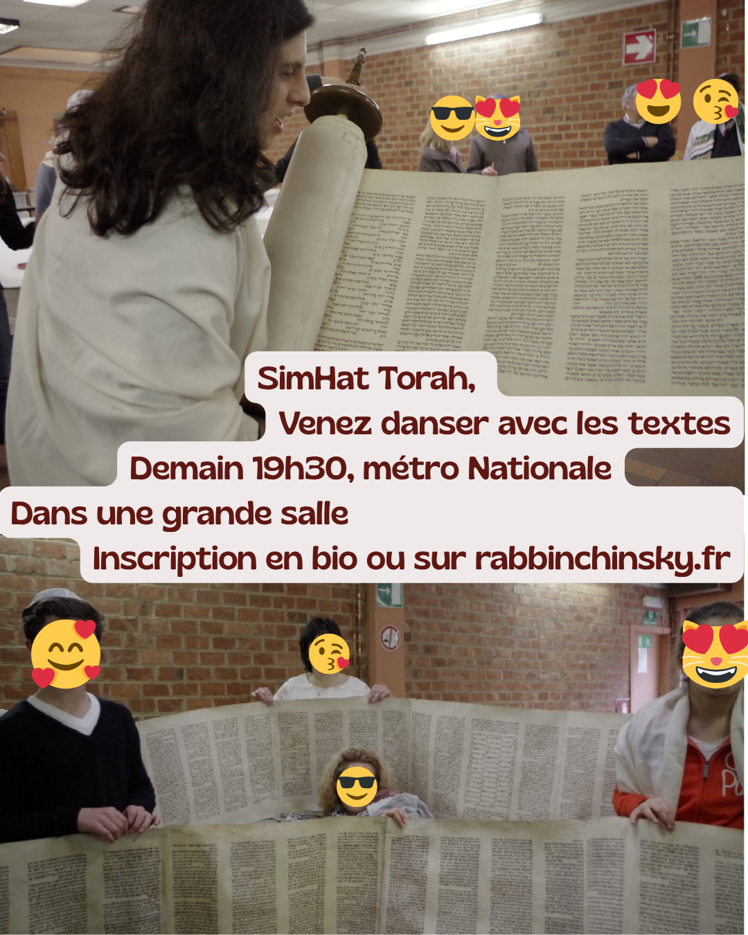 Pour SimHat Torah, demain soir, nous avons une grande salle pour danser avec le sefer, et des livrets aves les chants et tout le nécessaire! Inscriptions jusqu’à demain 12h, en vous envoie l’adresse de SimHat Torah demain à 13h. Je vous rappelle que mardi matin l’office aura lieu de 8h à 9h15, pour permettre aux personnes qui travaillent de participer. Inscrivez-vous vite!