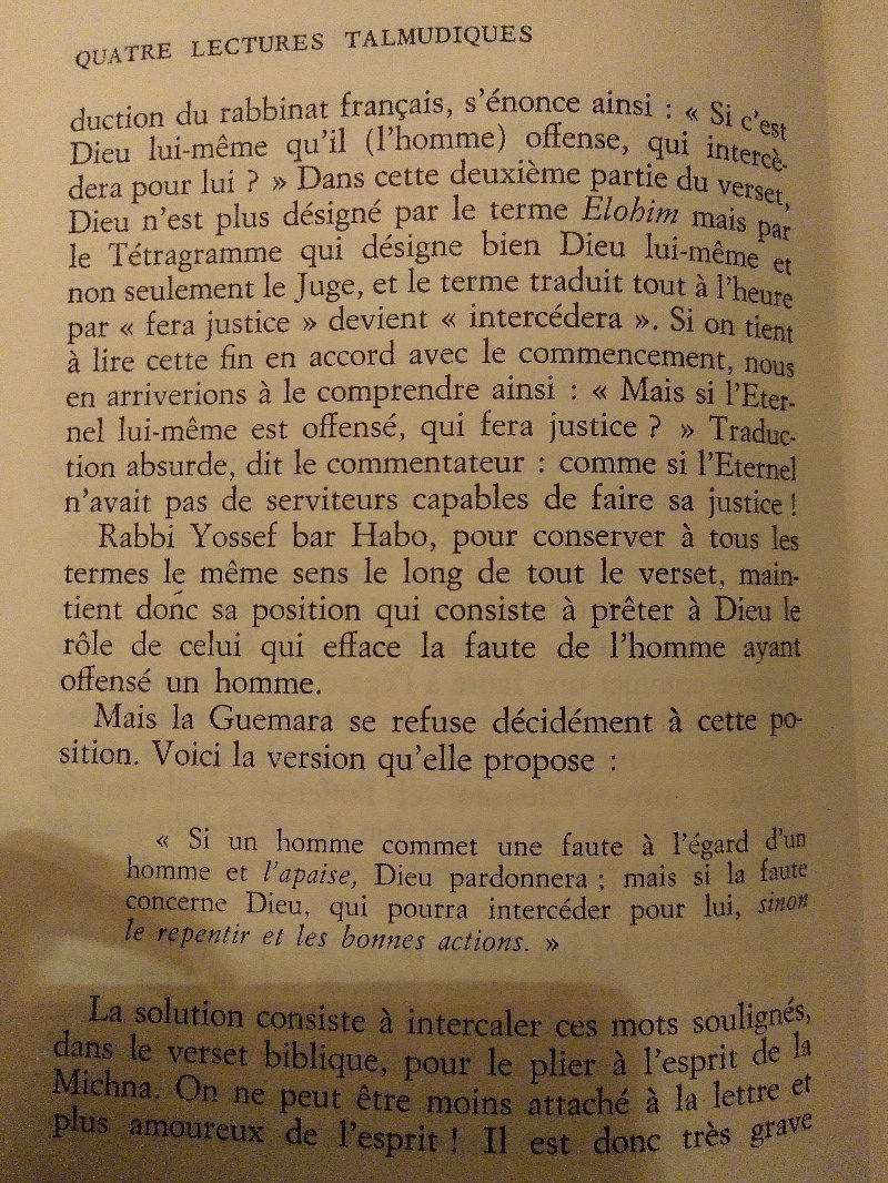 Rabbi Yosef bar Habo a objecté à Rabi Abahou les fautes qui sont entre l’adam et son ami YOH »K ne recouvre pas et c’est ce qui est écrit si un homme faute envers un homme élohim intercède qu’est-ce que c’est élohim un juge si c’est ainsi je dis lis la fin et si un homme faute envers élohim qui intercèdera pour lui comme il est dit si un homme faute envers un homme et elohim intercède pour lui il lui pardonnera et si c’est vers l’Eternel que l’homme faute qui intercédera pour lui la téchouva et les bonnes actions