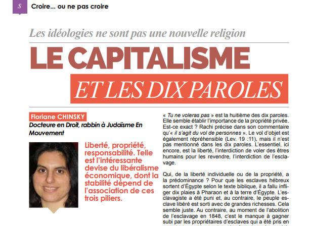 Liberté, propriété, responsabilité. Telle est l’intéressante devise du libéralisme économique, dont la stabilité dépend de l’association de ces trois piliers.  La crise de 2008 a provoqué la rupture du troisième principe, avec une intervention étatique de type « état providence » normalement réservée aux approches socialistes, orientée en revanche non pas vers les plus pauvres, mais vers les institutions bancaires en détresse. Les écarts sociaux se creusent. Les grèves se poursuivent en France. Bref, la religion néo-libérale a subi une mutation, et fait face à une crise sérieuse, elle entre en collision avec l’exigence de la justice sociale et l’imminence du changement climatique. Qu’en pense le judaïsme ?
