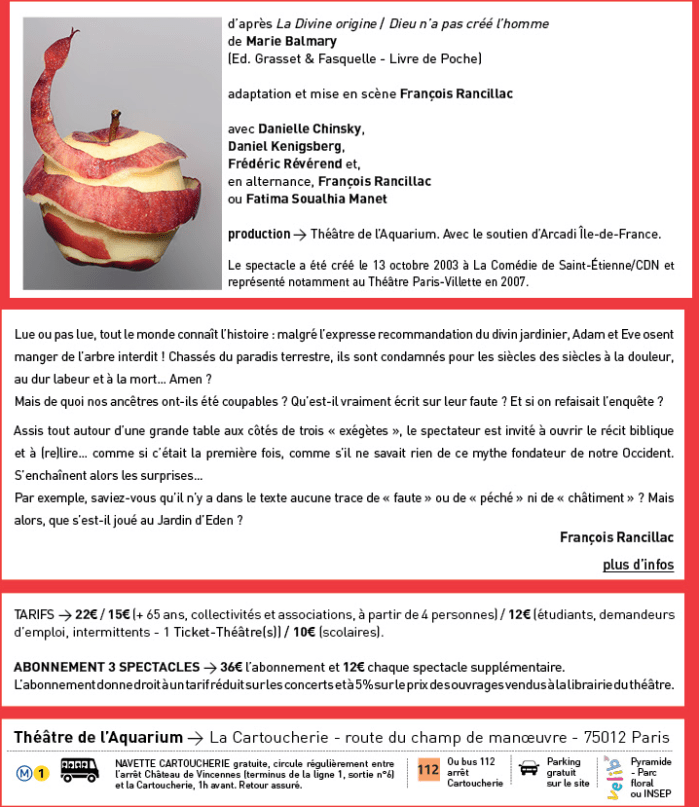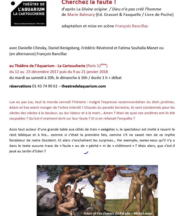 Notre Rabbin rendra l’invitation et participera à un débat qui suivra la représentation, le mercredi 10 janvier au théâtre de l’aquarium.